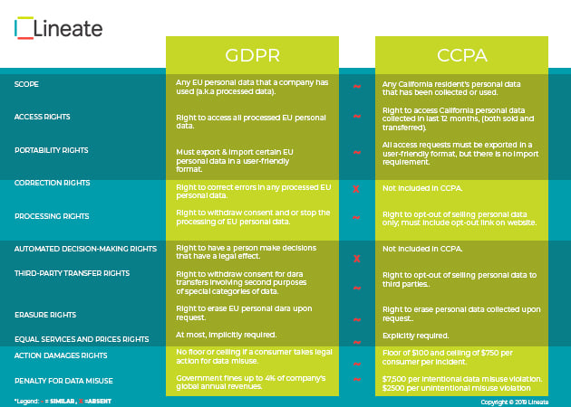In many ways, CCPA is very similar to GDPR. That’s great news if your company is already GDPR compliant. However, there are some key differences. CCPR allows California individuals much greater access to their data records than their EU counterparts. And, in terms of responses to data breaches, CCPA is actually more lax. There are slight differences throughout, and fortunately, we’ve created a chart if you’re looking for a quick rundown!